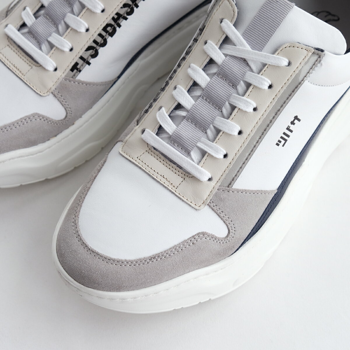 アッパーはカーフとスウェードのレザーコンビによるカラーブロックデザイン。