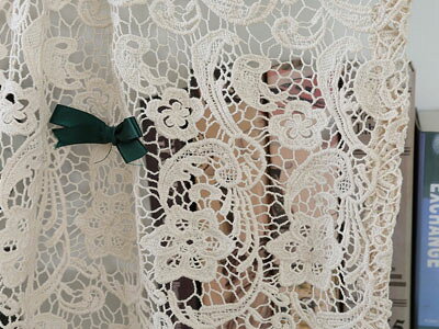 薔薇の小物・雑貨シリーズ: 手編み風レースカフェカーテン 幅95×長さ65cmタイプ 手編み風レースがボリューム感があり、緑のリボンも良いアクセントになっています。